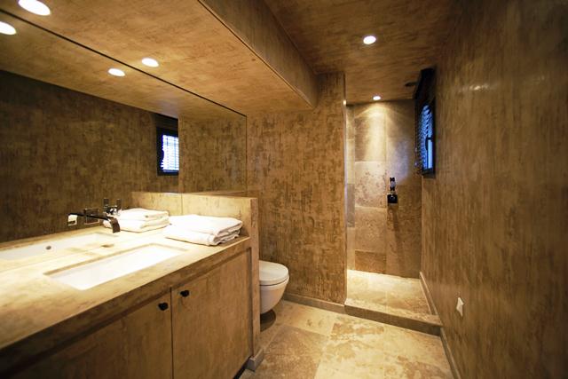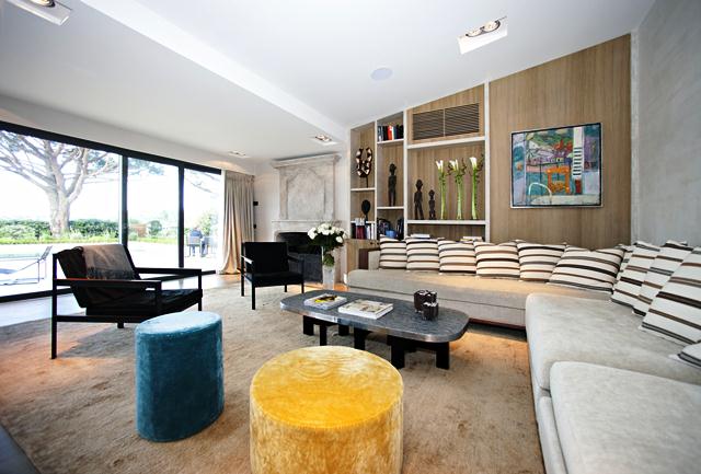 Vue du salon avec bibliothèque intégrée, meubles d’artsites et canapé sur mesure