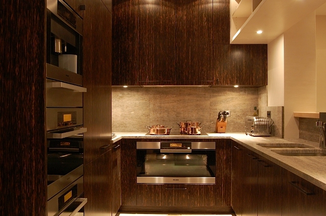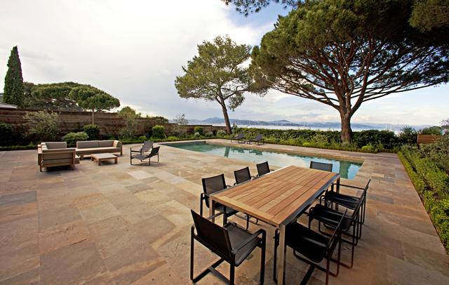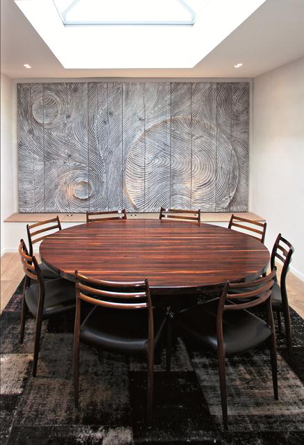 Détail salle à manger, table et panneau sculpté réalisés sur mesure, sièges vintage danois